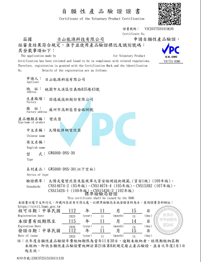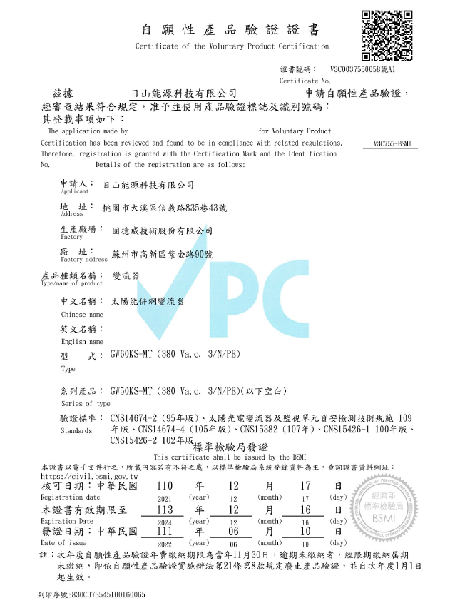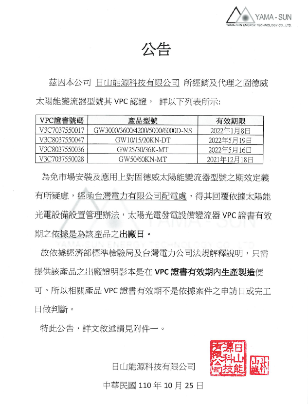 變流器VPC 效期定義為免市場安裝及應用上對固德威太陽能變流器型號之期效定義有所疑慮,經函台灣電力有限公司配電處,得期回覆依據太陽能光電設備管理法,太陽光電發電設備變流器VPC證書有效期之依據是為該產品之出廠日。   ...