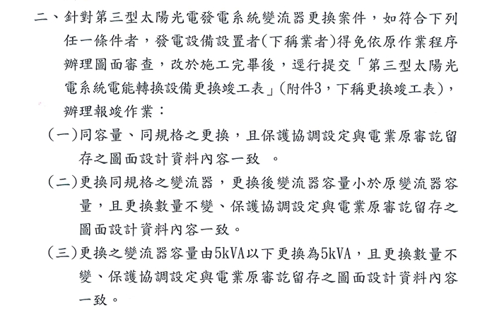 二、針對第三型太陽光電發電系統變流器更換案件,如符合下列任一條件者,發電設備設置者(下稱業者)得免依原作業程序辦理圖面審查,改於施工完畢後,逕行提交「第三型太陽光電系統電能轉換設備更換竣工表」(下稱更竣工表),辦理報竣作業: